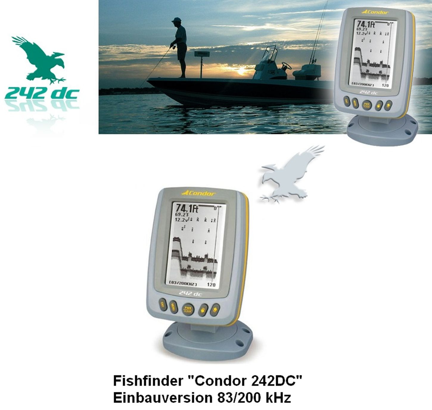 Der Condor 242 dc bietet alle Vorteile eines modernen Weitwinkel Fischfinders in einem kompakten Gehäuse.