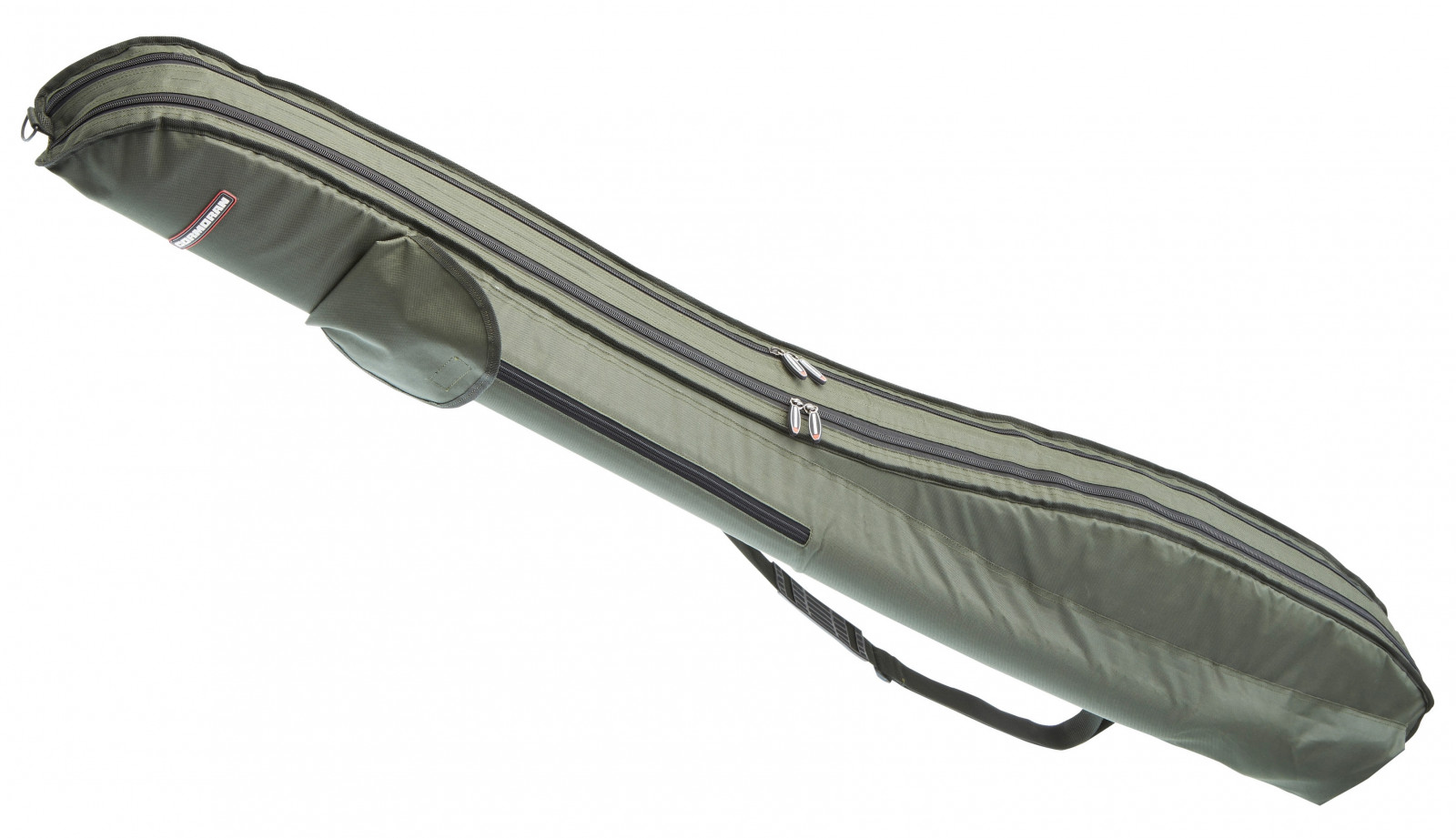 Mit einer langen Außentasche für Rutenständer etc., die per Reißverschluss weit geöffnet werden kann und mit einer Lasche verschlossen wird.